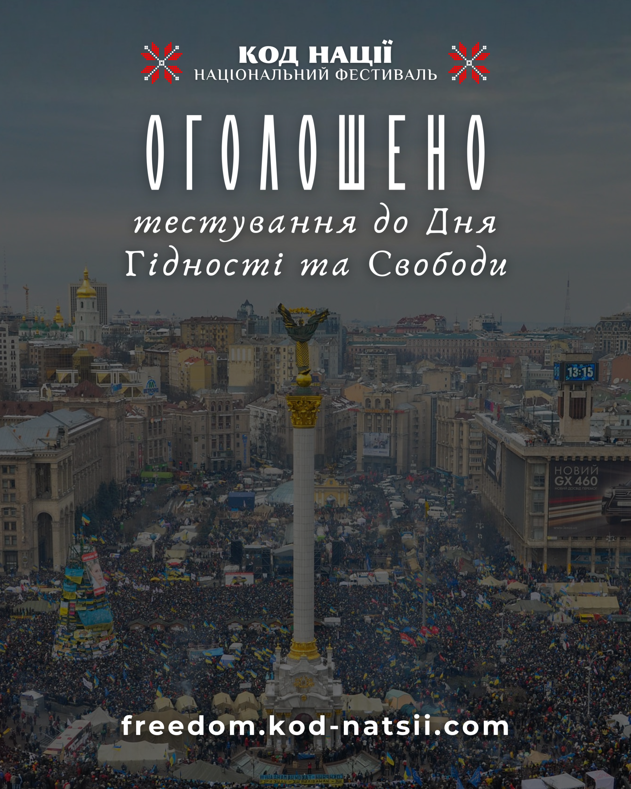 Освітньою платформою Національного Фестивалю “Код Нації” оголошено проведення Тестування до Дня Гідності та Свободи, яке покликане поглибити розуміння учасниками історичної значущості Революції Гідності, стимулювати інтерес до вивчення української історії та формування свідомої громадянської позиції в сучасному українському суспільстві. Методичне забезпечення