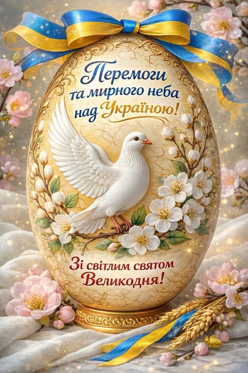 Нехай світле свято Воскресіння Христового наповнить ваше серце радістю, вірою та надією. Нехай у домі панують мир, злагода і любов, а Господь оберігає вас і ваших близьких від усякого лиха. Бажаємо міцного здоров’я, душевного тепла та благословення на кожен день. Нехай у житті завжди перемагає добро, а серце наповнюється світлом і спокоєм.