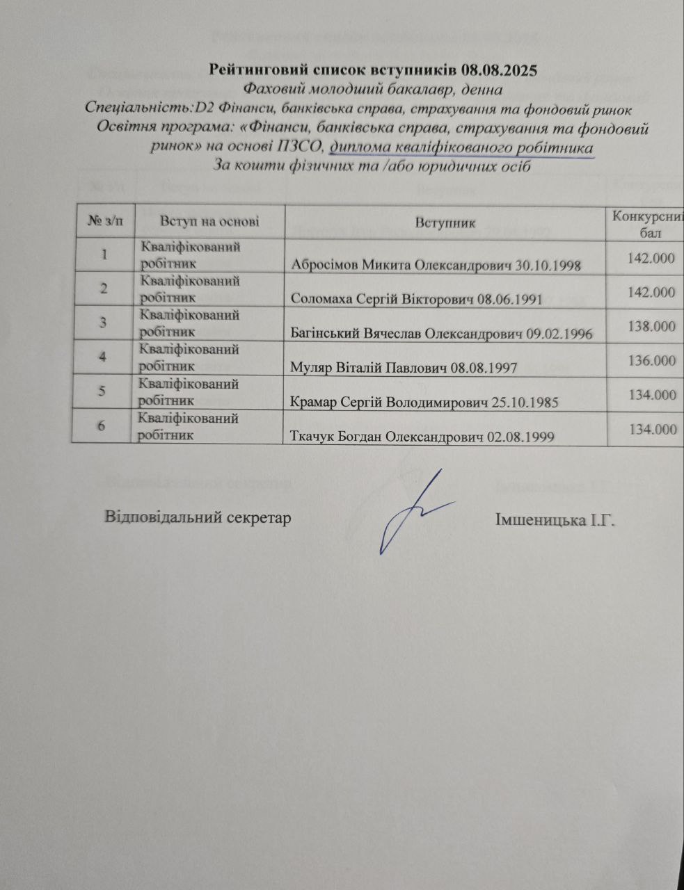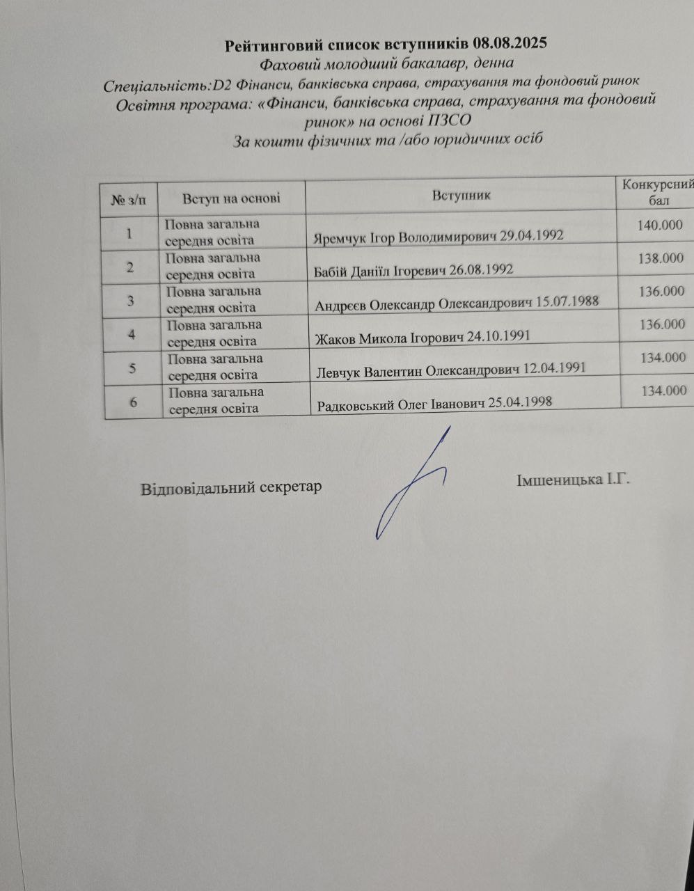 Фаховий молодший бакалавр 072 Фінанси, банківська справа, страхування та фондовий ринок на основі ПЗСО – рейтинговий список