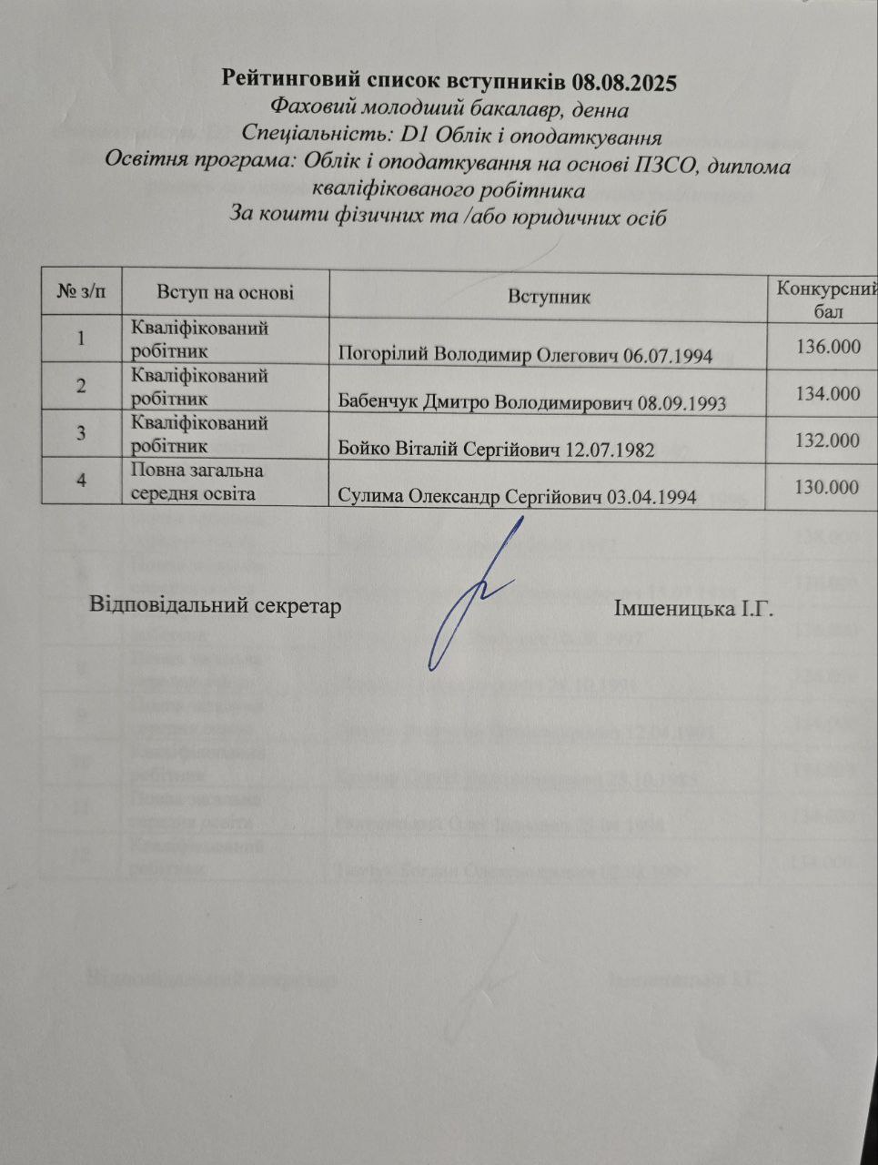Фаховий молодший бакалавр 071 Облік і оподаткування на основі ПЗСО – рейтинговий список