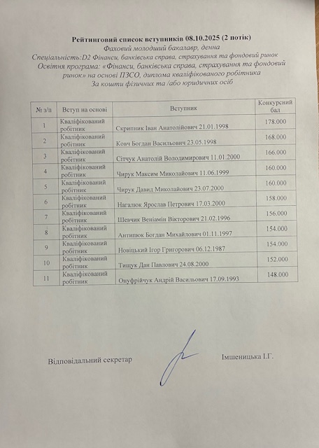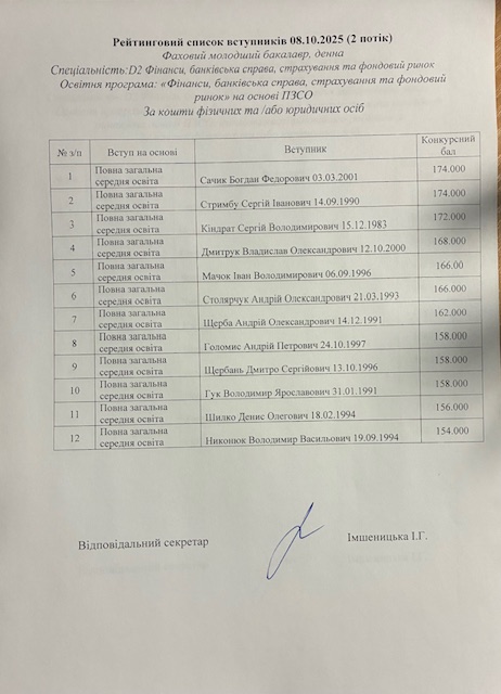 Фаховий молодший бакалавр 072 Фінанси, банківська справа, страхування та фондовий ринок   на основі ПЗСО – рейтинговий список